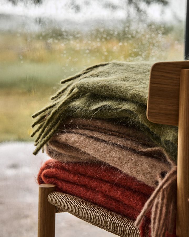 Auch Wohntextilien wie Wollteppiche, kuschelige Wolldecken von Klippan Yllefabrik und Kissenbezügen, die Sofas beleben. Auch praktische Küchenutensilien wie Salz- und Pfeffermühlen, Schneidebretter, Tabletts, Küchenrollenhalter und Topflappen. Auch der gedeckte Tisch verdient die volle Aufmerksamkeit, z.B. in Form von beliebtem Steingut Geschirr, Besteck, Kaffeetassen. Weinkühler für die warme Jahreszeit, sowie Teekannen im Winter sind bei uns besonders beliebt.
