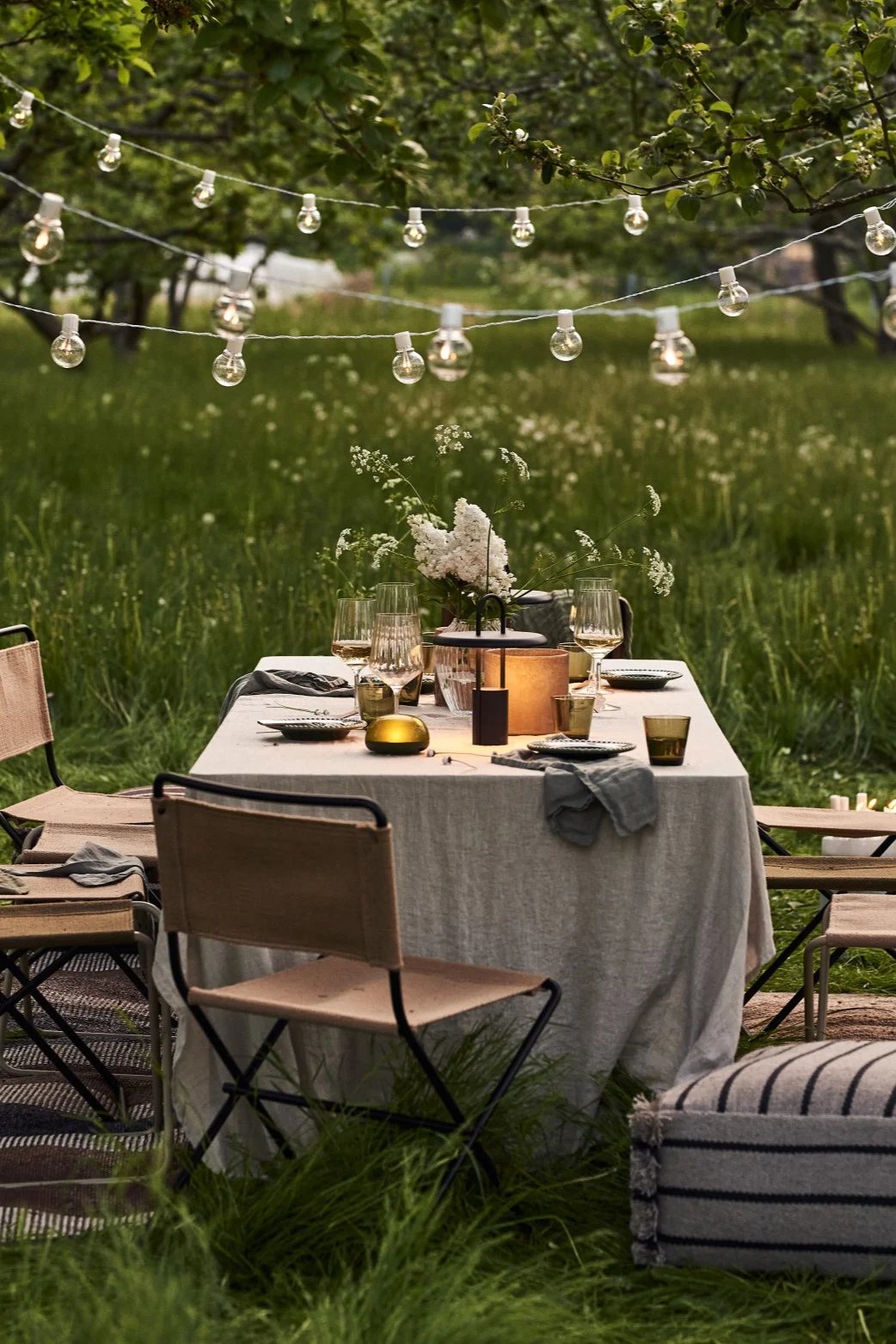 Nutzen Sie kabellose Tischleuchten, um für eine angenehme Beleuchtung während Ihres gemütlichen Abendessens im Garten zu sorgen.