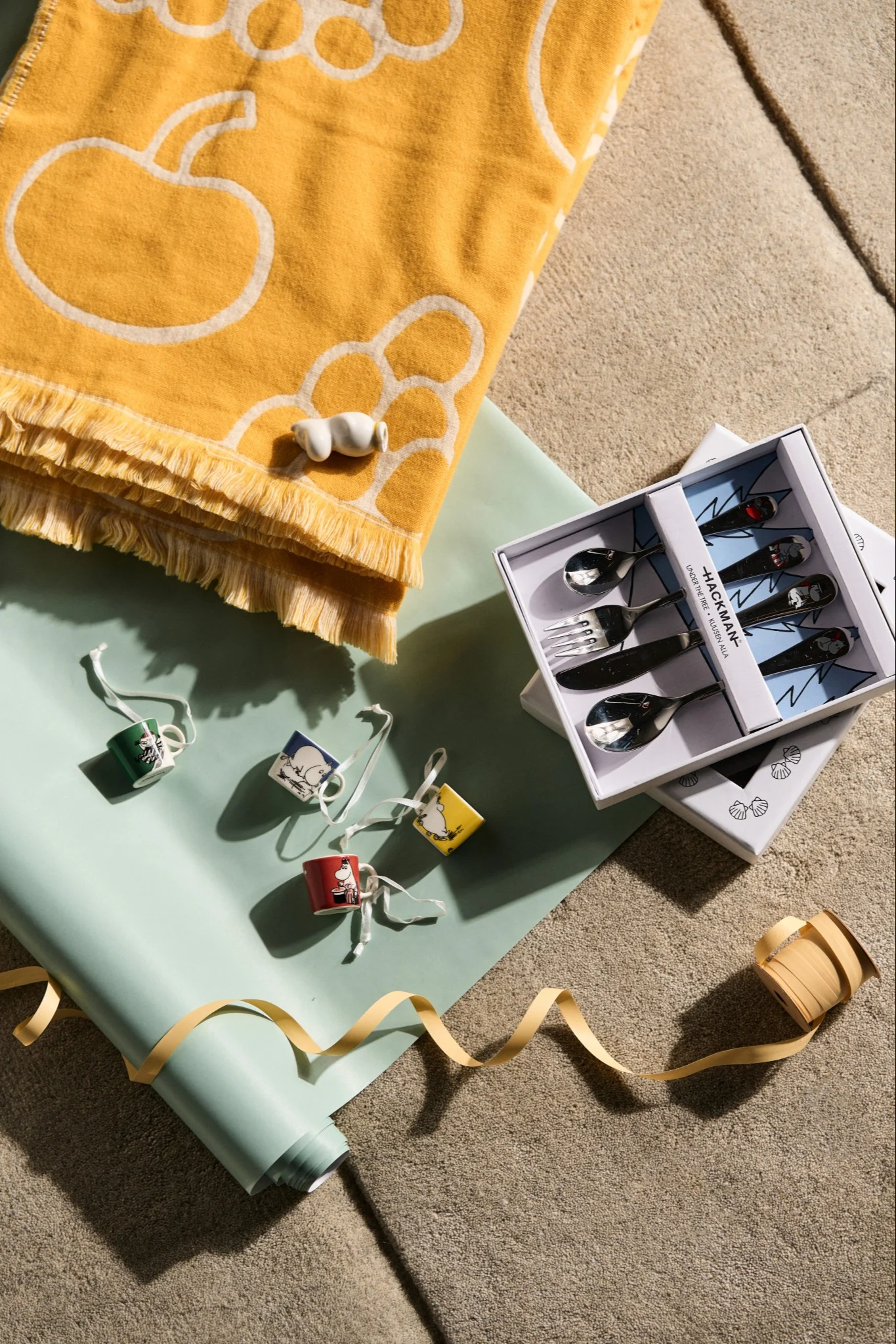 Für später empfiehlt sich auch das mit Mumin-Motiven versehende Kinderbesteck der Marke Hackman, dessen Verpackung sich sogar in einen Bilderrahmen verwandeln lässt.