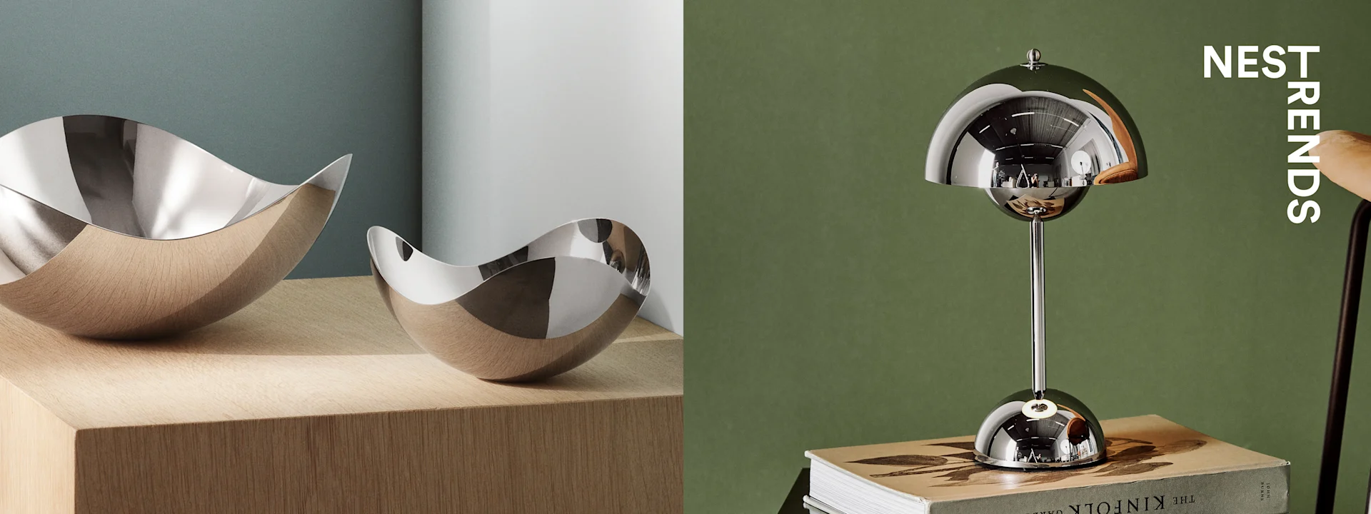 Einrichtungsgegenstände mit polierten Metalloberflächen wie Chrom sind ein Trend, der im Jahr 2025 unsere Häuser zum Glänzen bringen wird. Es bleibt Ihnen überlassen, ob Sie mutig ganzheitlich in Weltraum-Optik dekorieren oder ob Sie sich für einige Akzente bei neutraler Basis entscheiden. Wichtig ist nur, dass es Ihnen Freude bereitet.