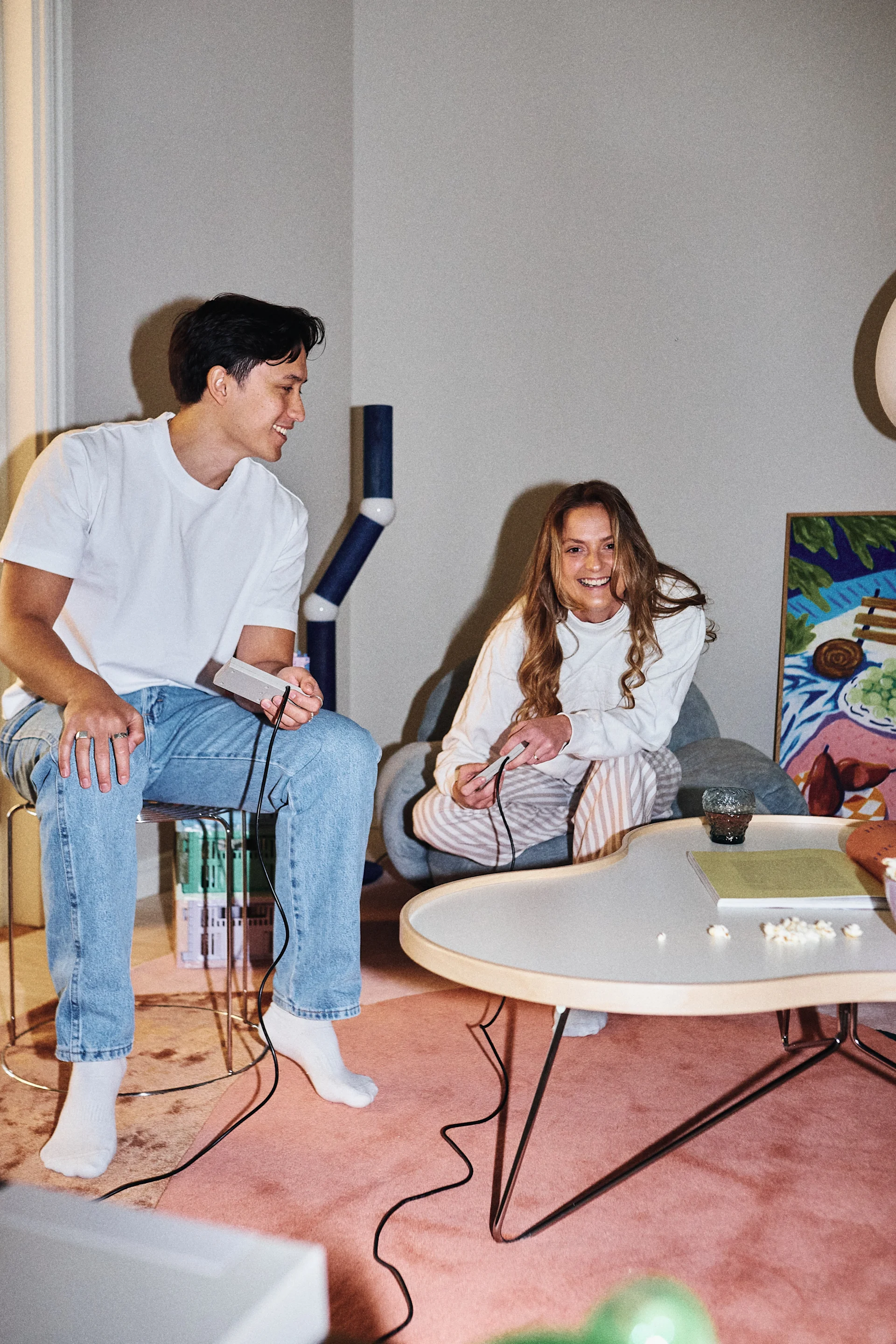 Die Farbpalette von Unique Vibes ist leuchtend und mutig: Orange, Fuchsia, ein von Nintendo inspiriertes Grün, leuchtendes Gelb, Lavendel- und Rottöne, Puderrosa und Blautöne, die in Türkis übergehen. Um den skandinavischen Look und das Gefühl beizubehalten, halten wir die Basis hell und clean, integrieren aber farbige Elemente, die unser Interieur herausfordern.