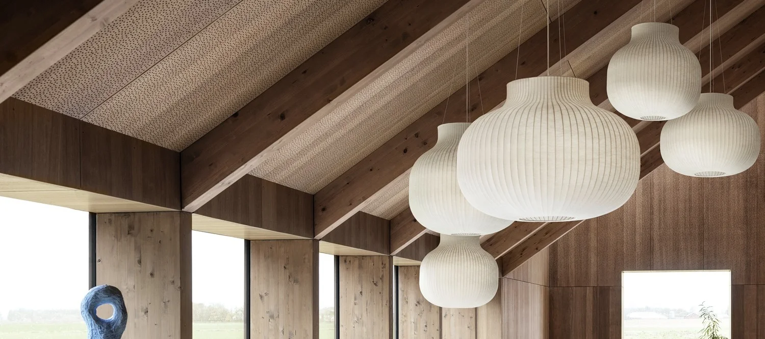 Ein Beispiel ist die Calm-Wandleuchte, die sanftes, diffuses Licht spendet und die Stimmung des natürlichen Sonnenuntergangs nachahmt. Ihr stoffbespanntes Design verbessert zudem die Akustik und schafft eine ruhige Atmosphäre.