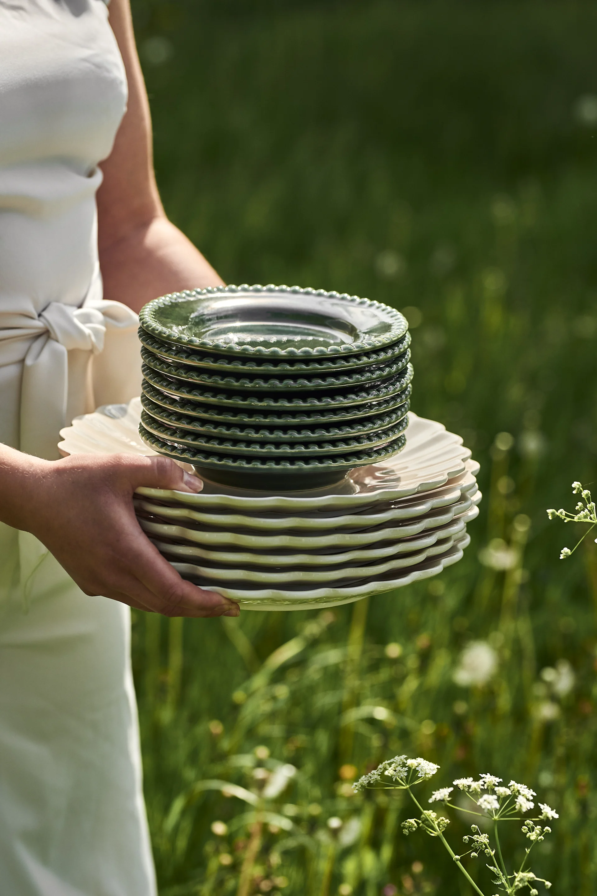 Steigern Sie das Sommergefühl, indem Sie den Tisch für die Sommerparty mit satten Naturfarben decken! Hier haben wir uns von den grünen Daria-Tellern von PotteryJo inspirieren lassen und sie mit den Oyster-Tellern von Mateus kombiniert. Die geschwungenen, gewellten Formen mit dem satten Grün sind ein stilvoller Kontrast. Dazu empfehlen wir Gläser, Krüge, Vasen und andere Details in Grüntönen hinzugefügt, um eine Ton-in-Ton-Gartenparty zu inspirieren.