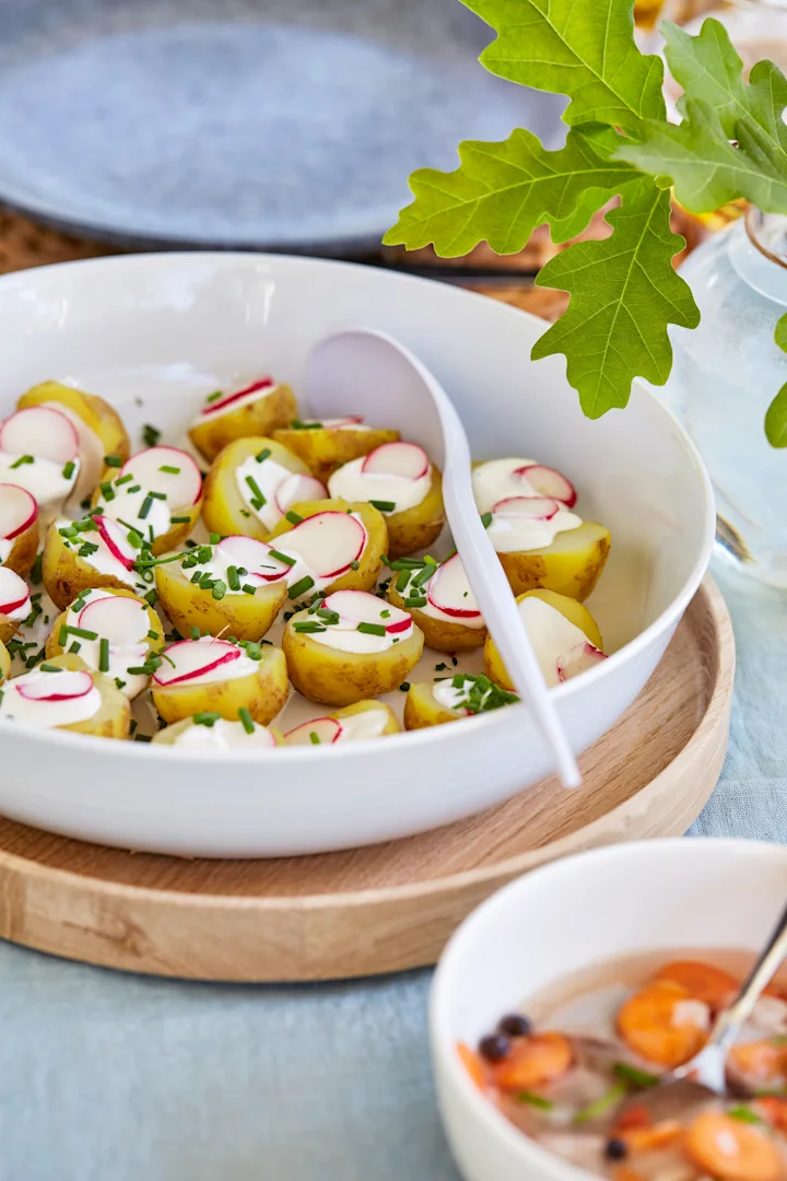 Funktionieren Sie den Daisy Tortenteller von Pottery Jo um und servieren Sie köstliche Vorspeisen oder Quiche darauf. Dekorieren Sie mit den Kastehelmi Windlichtern von Iittala, dem Design with light Blumentopf, dem Tota Windlicht von AYTM und der Skeppsholmen Paraffinleuchte von Karlskrona Lampfabrik.