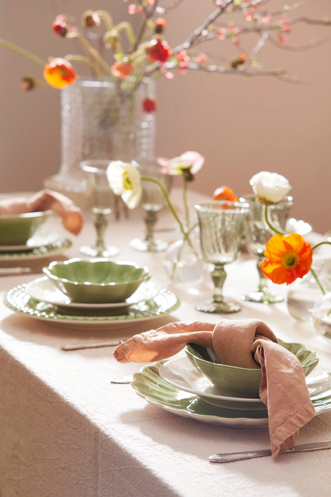 Beginnen Sie mit einer hellen, frühlingshaften Basis. Eine pastellfarbene oder gemusterte Tischdecke sorgt für eine freundliche und festliche Atmosphäre. Setzen Sie auf sanfte Farbtöne wie Rosa, Hellblau oder Mintgrün, um den verspielten Charakter zu unterstreichen. Kombinieren Sie dazu fröhlich gemustertes oder farbenfrohes Geschirr – zum Beispiel mit floralen Mustern oder zarten Punkten. Bunte Teller, Gläser mit farbigen Rändern und frühlingshafte Servietten bringen zusätzliche Frische auf den Tisch.
