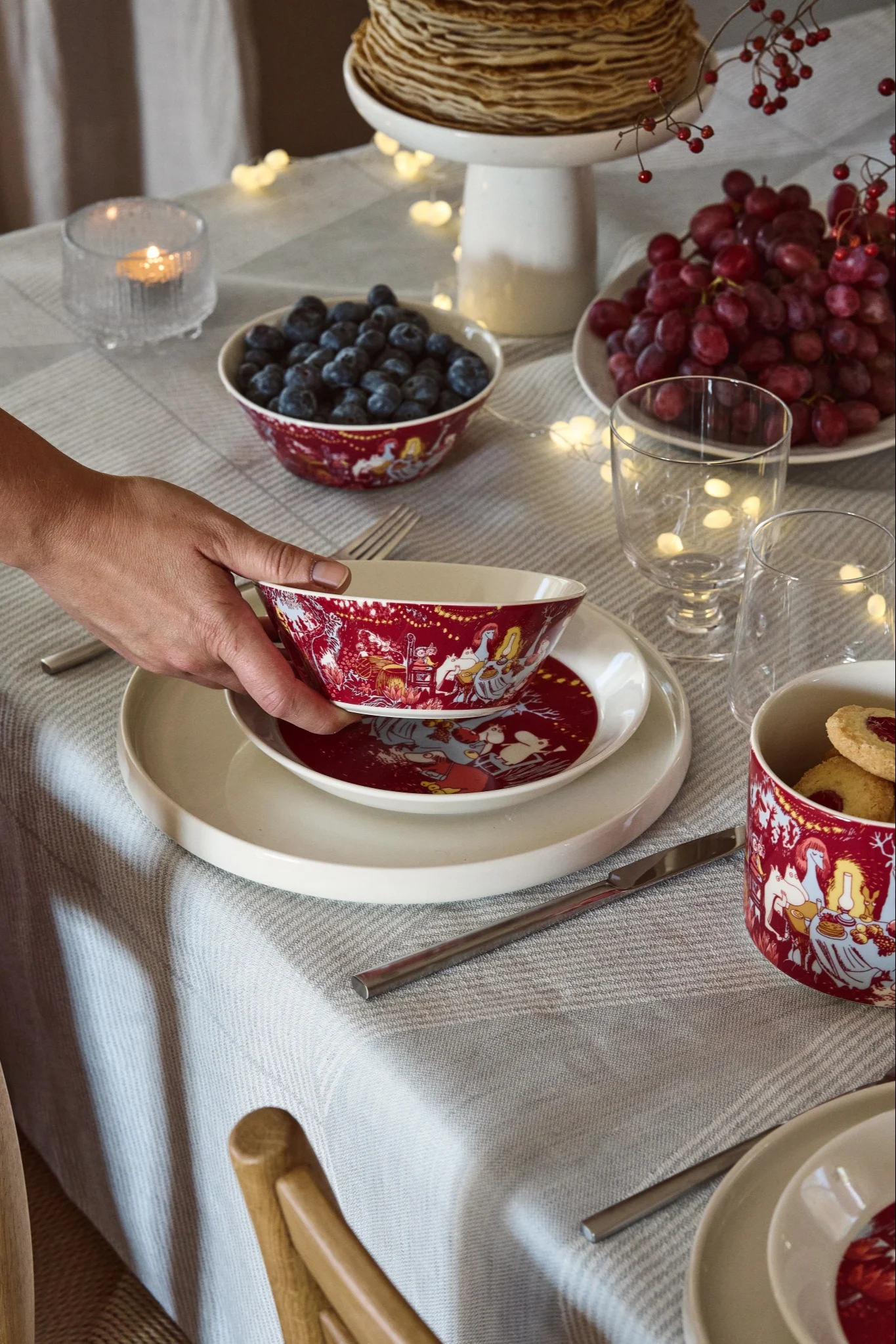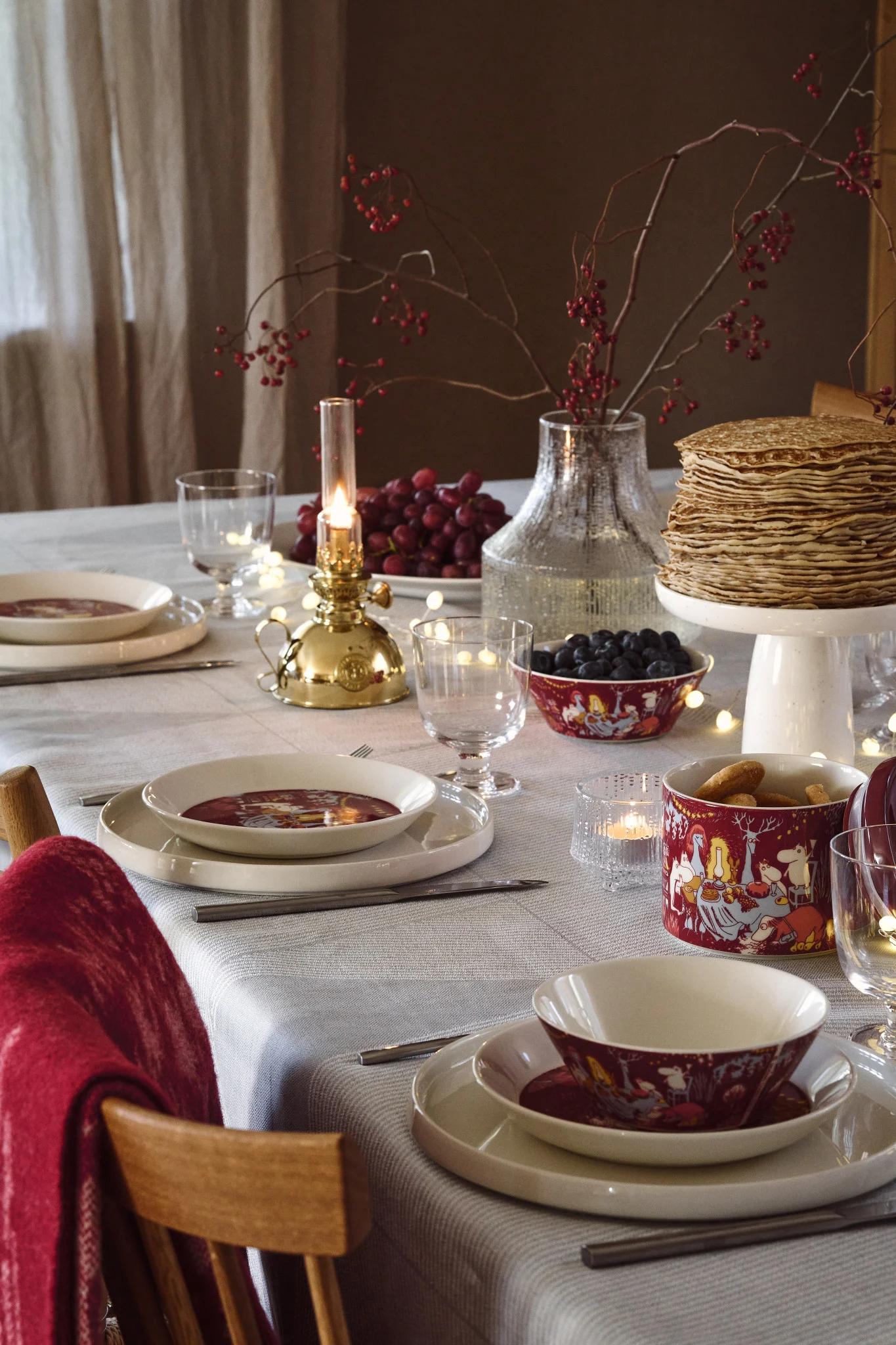 Für ein fröhliches, gemütliches Weihnachtsessen mit der ganzen Familie eignet sich ein verspielter Stil. Die Serie Festive Moments von Moomin Arabia kombiniert tiefes Rot mit liebevollen Illustrationen aus der Welt der Mumins – ideal, um Ihrem Tisch eine persönliche, warme Note zu verleihen.