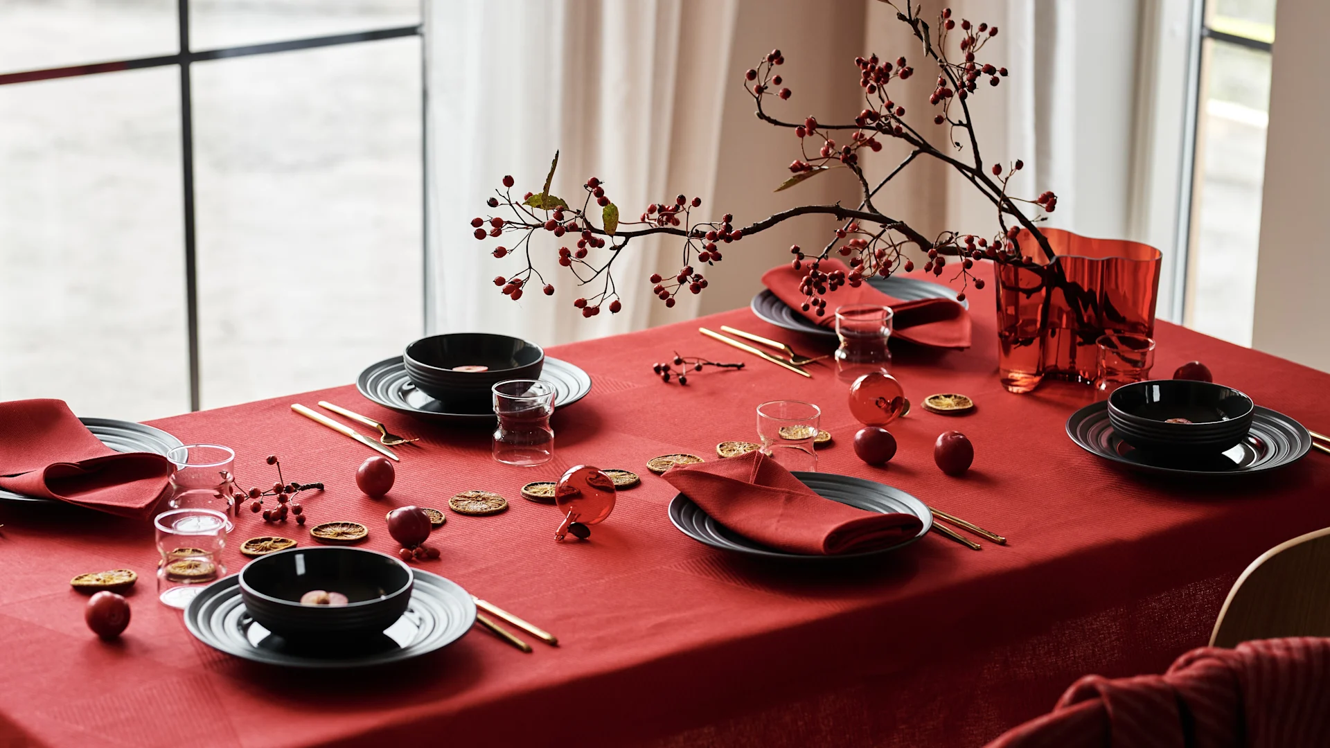 Für alle, die eine moderne Tischdeko bevorzugen, ist die Kombination aus Rot und Schwarz ein eindrucksvoller Blickfang. Die klaren Formen und grafischen Linien der Lines-Kollektion von NJRD bringen moderne Eleganz auf den Tisch.