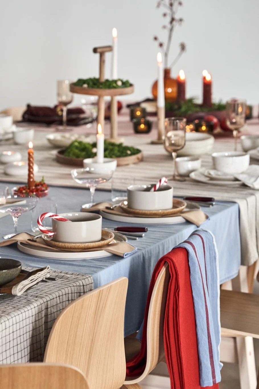 Eine luxuriöse Tischdecke wie das Rick Tischtuch von Olsson & Jensen ist der perfekte Hintergrund für eine weihnachtliche Tischlandschaft mit vielen natürlichen Elementen.