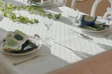 Das Draken Tischtuch 150 x 300 cm von schwedischen Almedahls ist aus 100% Baumwolle hergestellt und mit einem lebendigen, aber gleichzeitig dezenten Muster verziert. Das rechteckige Tischtuch verleiht dem Esstisch einen eleganten Ausdruck und schützt gleichzeitig die Tischplatte vor Verschüttungen. Schaffen Sie eine schöne Tischdekoration mit dem Draken sowohl im Alltag als auch bei Festen und beenden Sie dies, indem Sie Ihr schönstes Porzellan platzieren.