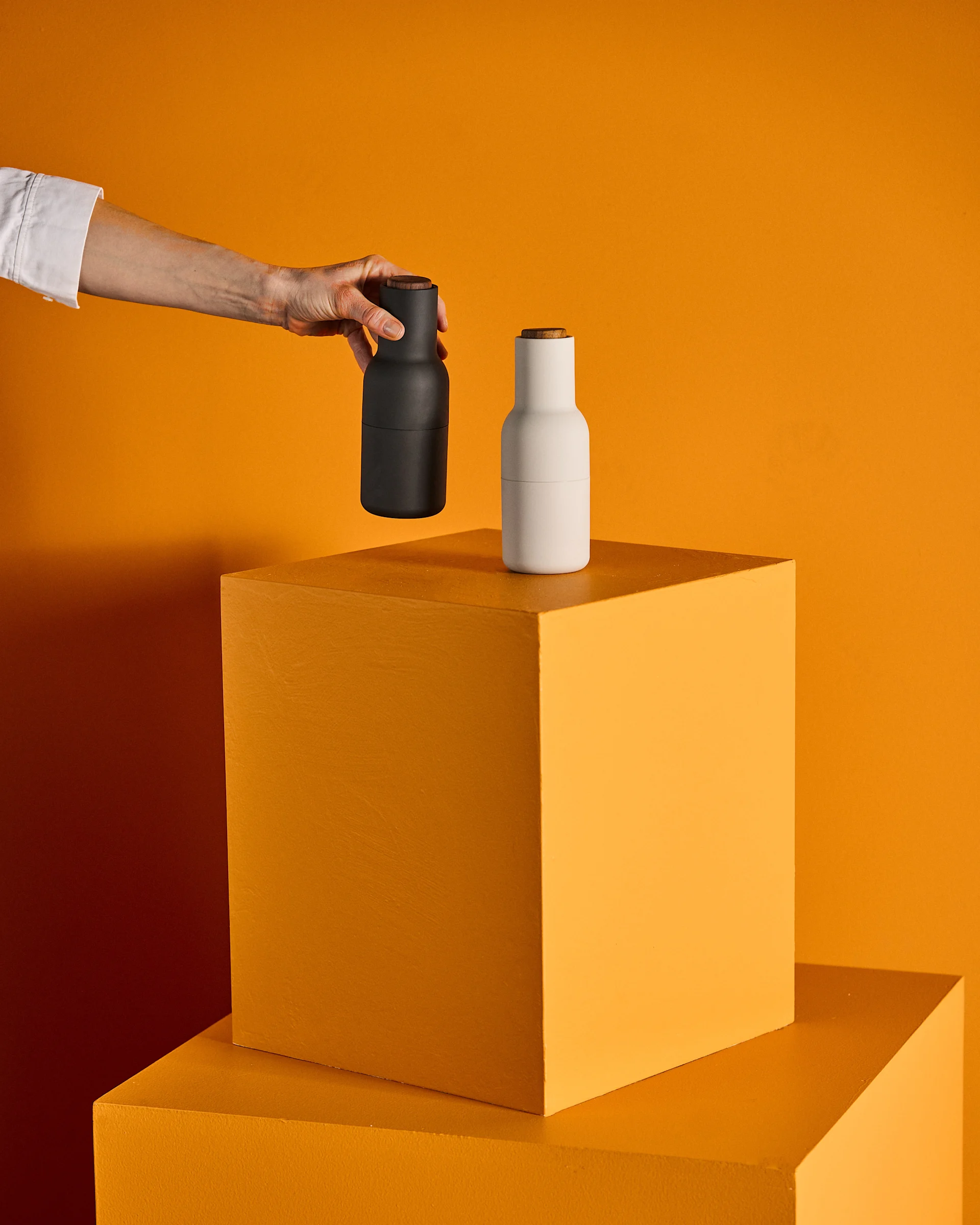 Audo Copenhagen ist vor allem auch für seine Pfeffer-und Salzmühlen, die beliebten Bottle Grinder Gewürzmühlen bekannt die in unterschiedlichen Variationen und in vielen verschiedenen Farben erhältlich sind. Die Form der Bottle Grinder Gewürzmühlen erinnert an Flaschen(Bottle) wobei das Mahlwerk am oberen Teil angebracht ist und somit Salz und Pfefferreste nicht auf der Küchentheke oder dem Esstisch landen. Der Deckel der Bottle Grinder Gewürzmühlen ist aus Holz oder Edelstahl gefertigt.
