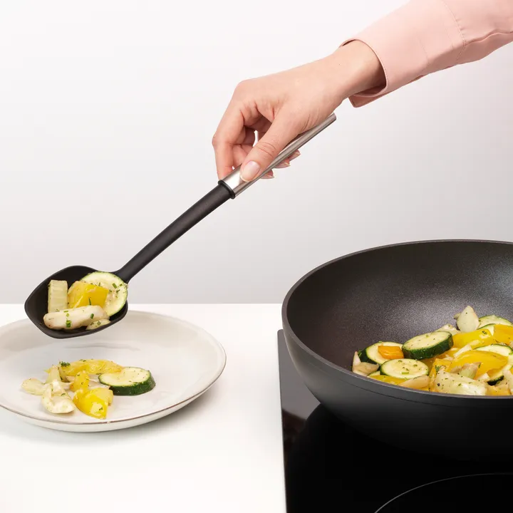 Der Profile Servierlöffel Antihaft von Brabantia zeichnet sich durch ein elegantes Design mit einem Griff aus rostfreiem Stahl und einer Schöpfkelle aus strapazierfähigem hitzebeständigem Material aus, das Temperaturen von bis zu 220°C standhält. Dank des Materials vermeiden Sie auch Kratzer in Kochgeschirr und Pfannen mit Antihaftbeschichtung. Der Löffel ist geeignet für die Zubereitung und das Servieren von allem, von Gemüse bis Pommes frites, und kann auch als Saucenlöffel verwendet werden.