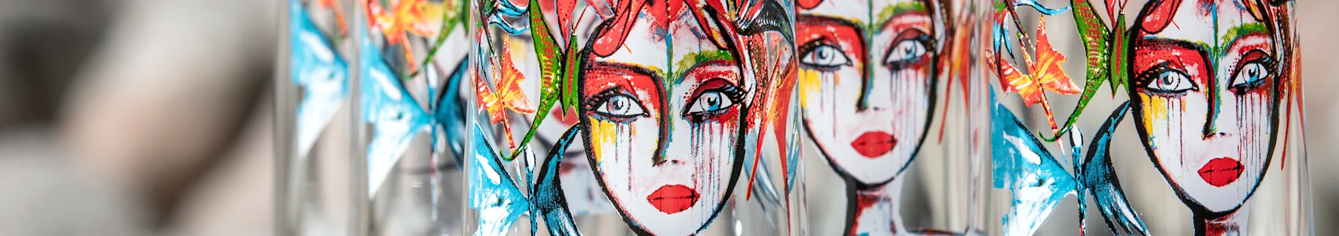 Die lebendigen Motive auf den Gläsern und dem Porzellan zeigen Frauenporträts. Die Inspiration für die Motive stammt von Frauen, die Carolina Gynning im Laufe ihres Lebens Leben getroffen und von denen sie Inspiration und Freude empfangen hat.