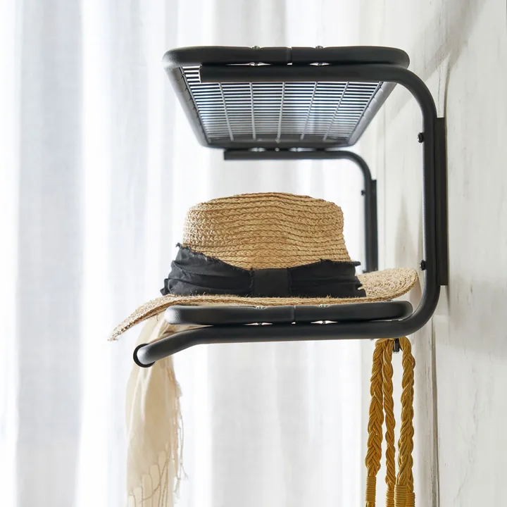 Das Classic 650 Hutregal von Essem Design, entworfen von Gunnar Bolin, ist ein ikonisches Regal mit runden Formen aus den 1950er Jahren. Mit verchromten Stahlrohrkonsolen und pulverbeschichteten Regalböden bietet es sowohl Stil als auch Funktionalität. Das Netz mit einer Drahtstärke von 2,25 mm und einer Maschenweite von 30 × 30 mm sorgt für Stabilität. Die Kleiderstange besteht aus kunststoffbeschichtetem Stahl mit einem Durchmesser von 19 mm. Die empfohlene maximale Kapazität beträgt zehn Kleiderbügel, was es perfekt für die organisierte Aufbewahrung in Ihrem Zuhause macht.