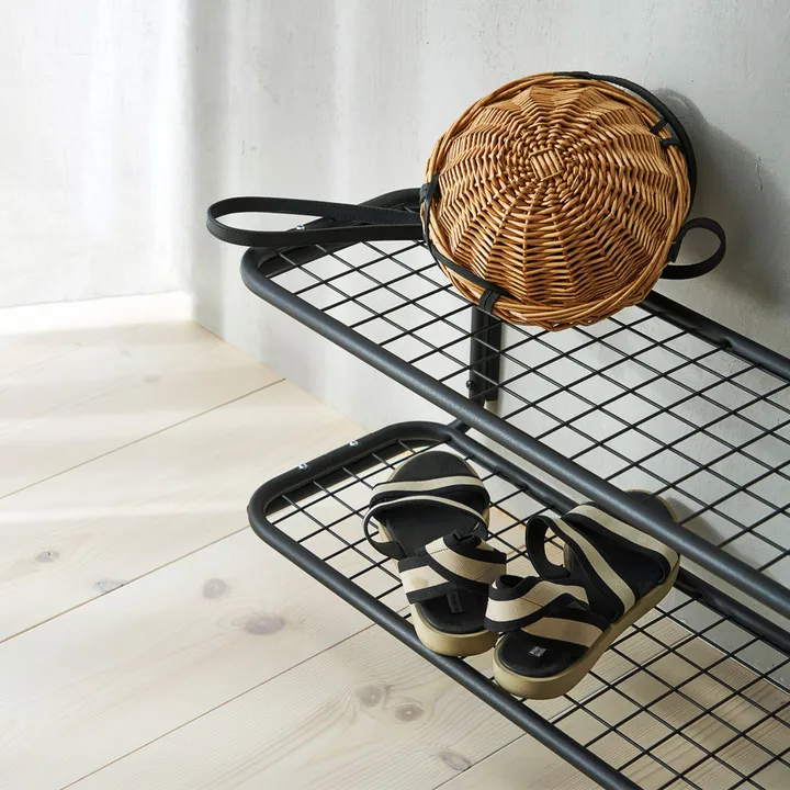 Das Classic 650 Schuhregal von Essem Design, entworfen von Gunnar Bolin, ist eine ikonische Aufbewahrungslösung aus den späten 1950er Jahren. Mit runden Formen und elegantem Design bleibt es weiterhin beliebt. Die Konsolen bestehen aus verchromten Stahlrohren (16 × 1,25 mm). Die Regalflächen bestehen aus pulverbeschichteten Stahlrohren mit 16 mm Durchmesser und einem Netz aus 2,25 mm Draht. Die Maschenweite beträgt 30 × 30 mm. Dieses Regal ist sowohl ästhetisch ansprechend als auch funktional in jedem Zuhause.