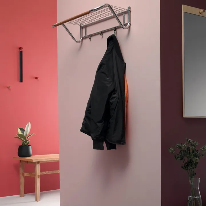 Das Funk Hutregal von Essem Design wurde von Mats Theselius entworfen. Hergestellt aus rostfreiem Stahl mit Eichenrundstab. Ursprünglich in den 90er Jahren gestaltet, wurde es kürzlich für die Produktion verfeinert, was ihm ein zeitloses Gefühl verleiht und es in verschiedene Innenräume passend macht.