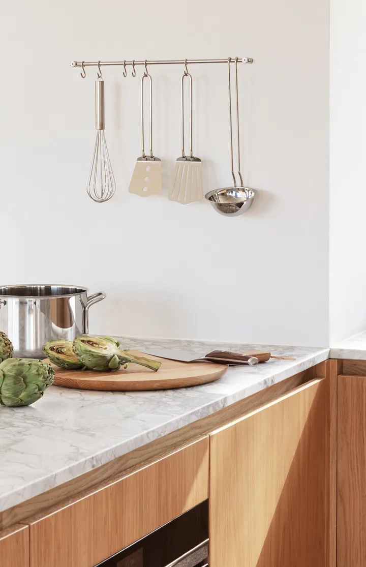 Die Eva Trio Küchenstange mit 6 S-Haken von Eva Solo. Entworfen von Ole Palsby, bietet die Küchenstange aus rostfreiem Stahl praktische, wandhängende Aufbewahrung. Perfekt zum Organisieren von Küchenutensilien, Pfannen oder Handtüchern. Funktioniert auch als Hakenleiste oder Kleiderstange in Flur und Schlafzimmer. Sparen Sie Platz und schaffen Sie Ordnung mit den mitgelieferten sechs S-Haken.