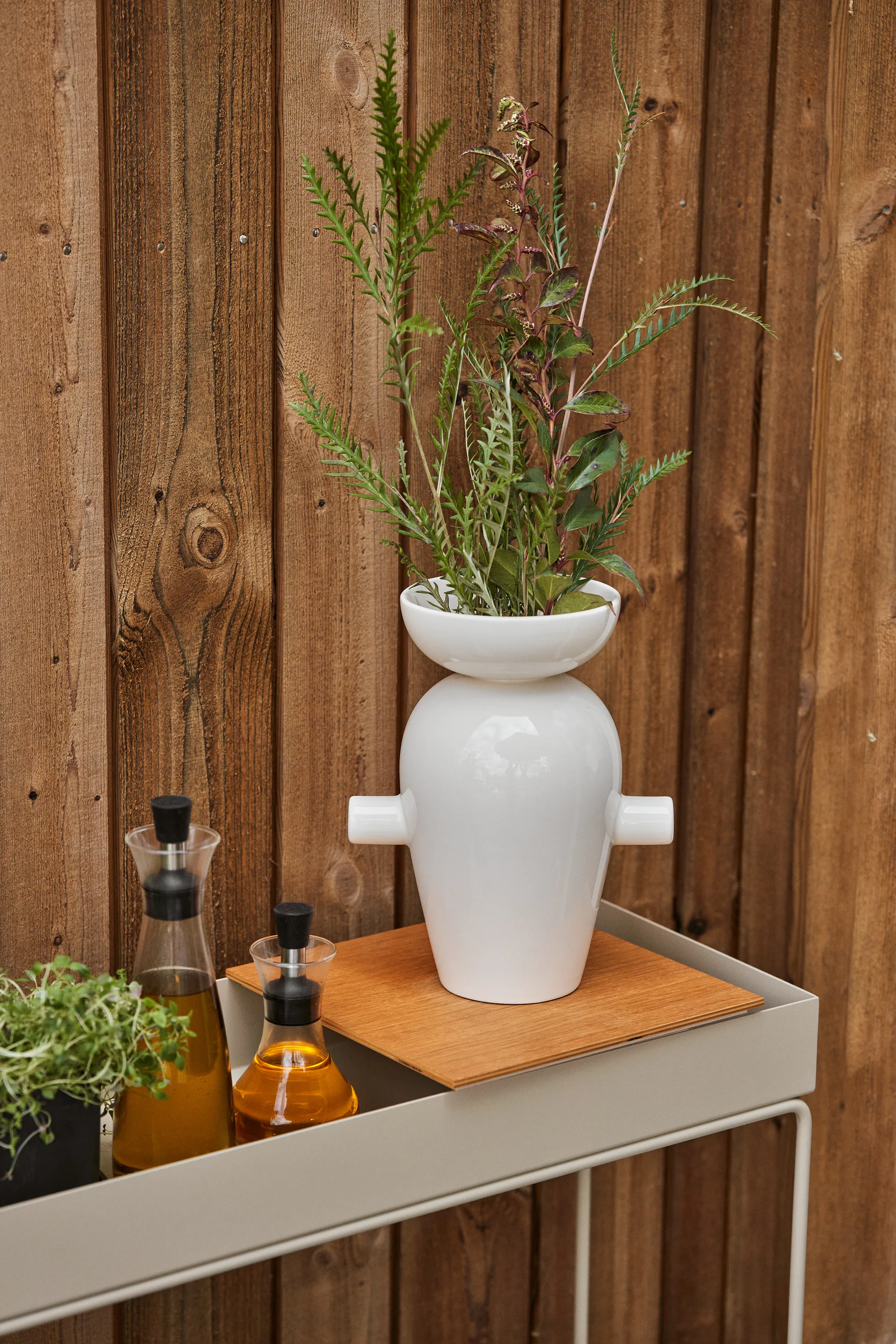 Mit dem Ferm Living Plant Box Abstelltisch hebt die dänische Marke Ferm Living die populäre Plant Box auf ein neues Level. Der Abstelltisch hat die gleichen stilvollen und minimalistischen Linien, die wir bereits von der traditionellen Plant Box gewohnt sind, dieses Mal jedoch in einer höheren Variante mit einem niedrigen Regal und einem Tablett. Im unteren Regal können Sie ein paar höhere Vasen oder andere größere Dekorationen platzieren und oben können Sie beispielsweise einen Blumentopf mit einer Pflanze, ein schönes Stillleben aus Büchern oder auch eine schöne Schale mit Schmuck drapieren. Da der Abstelltisch wasserfest ist, eignet er sich auch hervorragend für den Balkon.