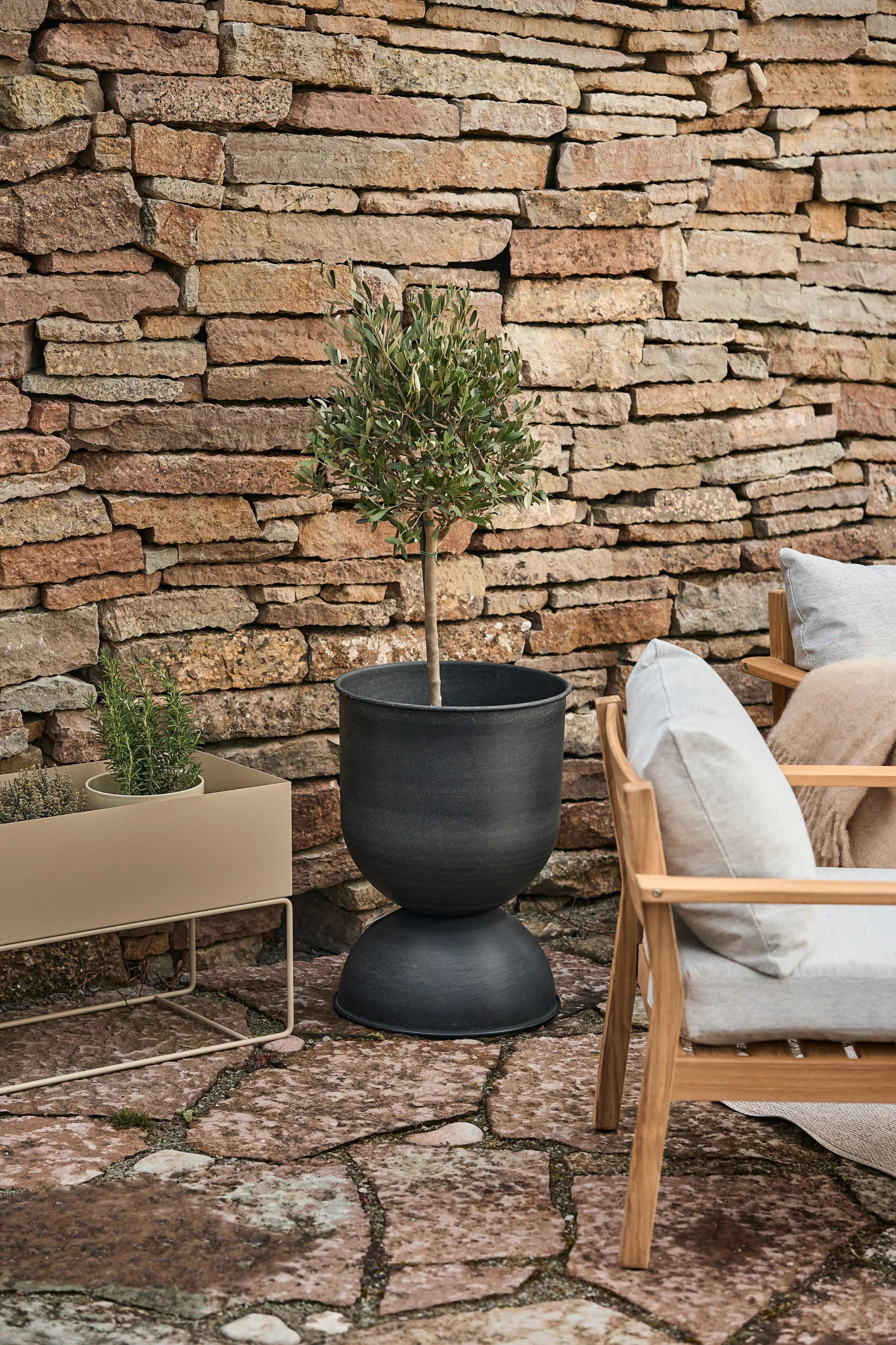 Hourglass Blumentopf groß Ø50 cm von Ferm Living ist ein auffälliger, sanduhrförmiger Blumentopf, der Ihre Pflanzen vom Boden hebt und ihnen einen schönen, erhöhten Platz im Zuhause bietet. Das Design ist durchdacht mit zwei wendbaren Schalen, die Flexibilität in der Nutzung bieten — verwenden Sie sie als höhere Fußstütze oder als geräumigen Pflanzbehälter mit viel Platz für die Wurzeln. Hergestellt aus pulverbeschichtetem Metall mit matter Oberfläche und spezieller Oberflächenbehandlung, die ihn widerstandsfähig genug für Terrasse oder Balkon macht. Einfach im Wohnzimmer, Flur oder auf der Terrasse zu platzieren für eine starke visuelle Wirkung.