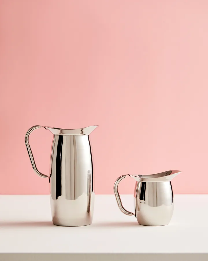Der Indian Steel Pitcher Kanne von der dänischen Marke HAY aus poliertem Edelstahl hat ein elegantes und funktionales Design. Der griffige Henkel ist so gestaltet, dass er gut in der Hand liegt, und zusammen mit dem breiten Ausguss wird das Ausgießen einfach und tropffrei. Die Kanne ist genauso schön zum Servieren wie als dekoratives Element auf einem Regal, wenn sie nicht benutzt wird. Die Kanne kann auch als Vase für ein schönes Blumengesteck verwendet werden.