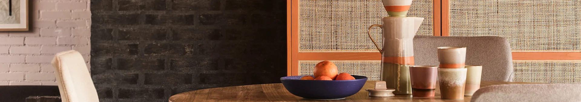 Vereinzelt findet man jedoch auch Geschirr aus anderen Materialien, wie zum Beispiel einen Teller aus Mangoholz oder ein Servierteller aus Beton im Sortiment von HKliving. Die Keramik Tassen und Becher von HKliving sind meist mit einer speziellen Glasur versehen, welche jedes Produkt einzigartig werden lässt.