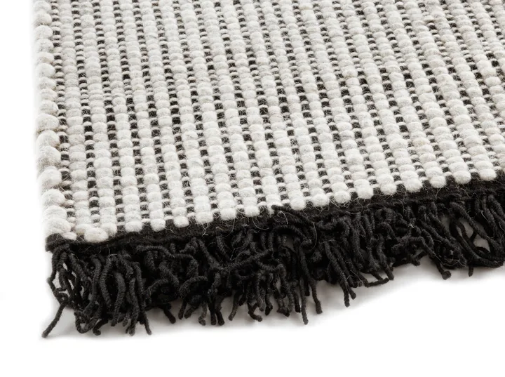 Nera Lana Teppich von Kateha ist handgewebt mit reiner Wolle sowohl in Kette als auch in Schuss, was ein authentisches Gefühl und natürliche Haltbarkeit verleiht. Der große Anteil gefilzter Wolle im Schuss schafft eine weiche, leicht strukturierte Oberfläche, die zum schönen Grund im Raum wird. Die verspielten schwarzen Wollfransen sind eine echte Fortsetzung der Kette — nicht angenäht oder aufgeklebt — und unterstreichen die Handwerkskunst und Echtheit des Teppichs. Nera Lana ist zudem wendbar, flexibel in der Nutzung und passt gleichermaßen gut unter die Sofagruppe wie in die Leseecke, wenn Sie Wärme und Charakter im Zuhause schaffen möchten.