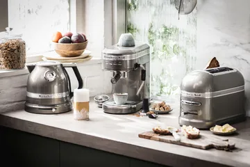 Der Artisan Toaster für 2 Scheiben von KitchenAid ist aus gegossenem Aluminium gefertigt und bietet sowohl Stil als auch Funktion. Mit einem automatischen Sensor, der das Brot absenkt und hebt, sowie einer Warmhaltefunktion wird jedes Röst-Ergebnis perfekt. Der Toaster verfügt außerdem über eine Sandwich-Funktion, eine Auftau-Funktion und eine Bagel-Funktion. Die extra breiten Schlitze machen ihn ideal für alle Brotsorten.