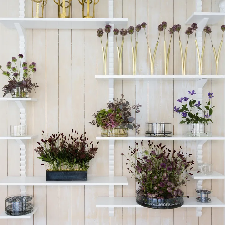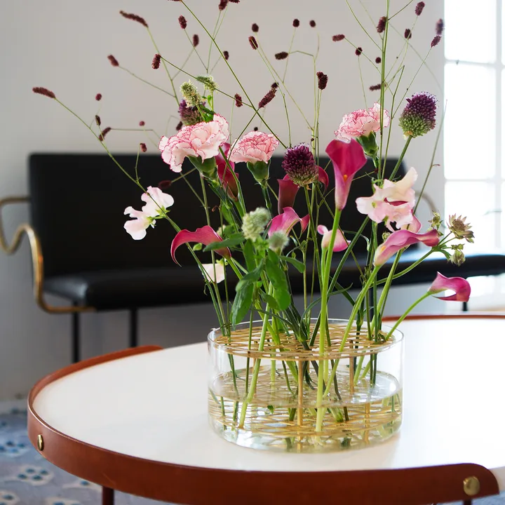 Äng Vase, groß von KLONG ist eine elegante Vase aus der Äng-Kollektion, entworfen von Eva Schildt. Das handgefertigte Metallgestell dient als integrierte Blumenstütze und verleiht deinen Schnittblumen Halt und schöne Struktur. Jede Vase erhält einen individuellen Ausdruck, da das Muster von Hand gefertigt wird, was jedes Exemplar besonders charmant macht. Das Messing ist lackiert, um Wasser zu widerstehen — reinigen Sie gründlich von Pflanzensaft und wechseln Sie das Blumenwasser häufig, um die Oberfläche zu erhalten. Perfekt für alle, die Blumen als warmes, skandinavisches Detail im Zuhause hervorheben möchten.