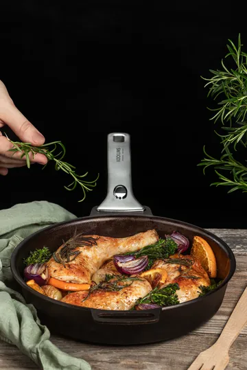 Der Griff für Pfanne/Pajform von Kockums Jernverk ist aus Kohlenstoffstahl und rostfreiem Stahl gefertigt. Dieser abnehmbare Griff macht das Kochen einfacher und sicherer, indem Sie die Pfanne oder die Pajform handhaben können, ohne sich zu verbrennen. Der Griff wird einfach mit einem Daumengriff an- und abgeklickt, was Platz auf dem Herd, im Ofen und bei der Lagerung spart. Passend für Kockums Jernverks Pfannen und Pajformen in den Größen 24, 28 und 30 cm sowie perforierte Formen.