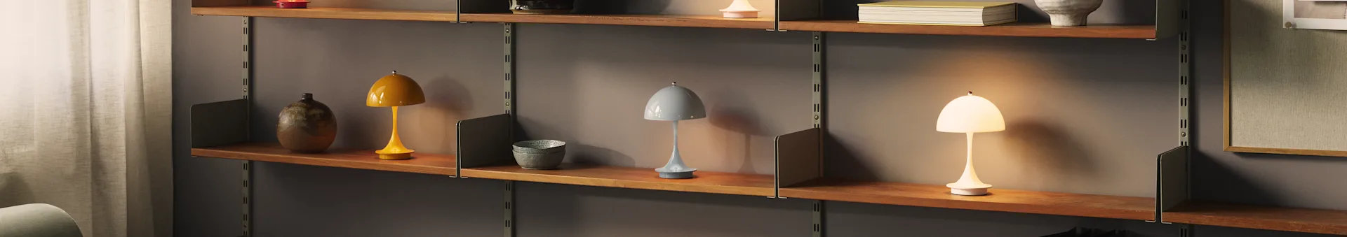 Lampen der Panthella-Serie verwenden verschiedene Arten von Glühbirnen. Einige haben eingebaute Lichtquellen und andere laufen sogar mit Batterie und können aufgeladen werden.