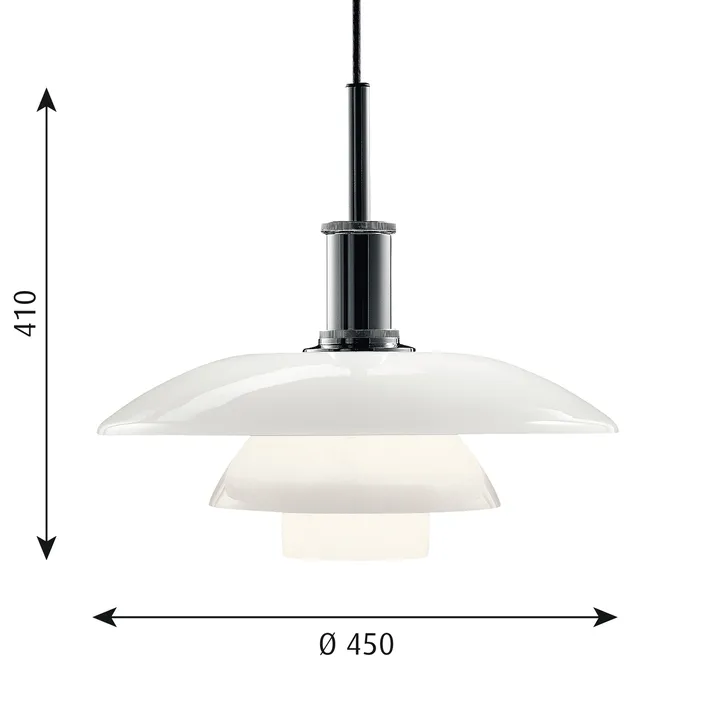 Die PH 4½-4 Opalglas Pendelleuchte von Louis Poulsen ist eine klassische und moderne Deckenleuchte, die unter anderem hervorragend über einen Esstisch passt. Die Leuchtenschirme bestehen aus einem dreischichtigen, reflektierenden mundgeblasenen Opalglas, welches das meiste Licht nach unten leitet. Sie sind außen glänzend und innen matt sandgestrahlt, was die Entstehung eines weichen und diffusen Lichtes ermöglicht. Das klassische Drei-Schirm-System wurde von dem dänischen Designer Poul Henningsen entworfen, der 1925-1926 in Zusammenarbeit mit Louis Poulsen die ersten PH-Leuchten für eine Ausstellung in Paris entwarf. Die Leuchte ist wie eine logarithmische Spirale aufgebaut, eine mathematische Spiralkurve, die man häufig in der Natur vorfindet und die eine gleichmäßige Verteilung des Lichts über den gesamten Schirm erzeugt. In Kombination mit der diffusen Reflexion durch das Opalglas entsteht ein weiches und blendfreies Licht. Die Ziffern der PH Leuchten beziehen sich auf die Größe der Leuchtenschirme und die Buchstaben stammen aus den Initialen des Designers.