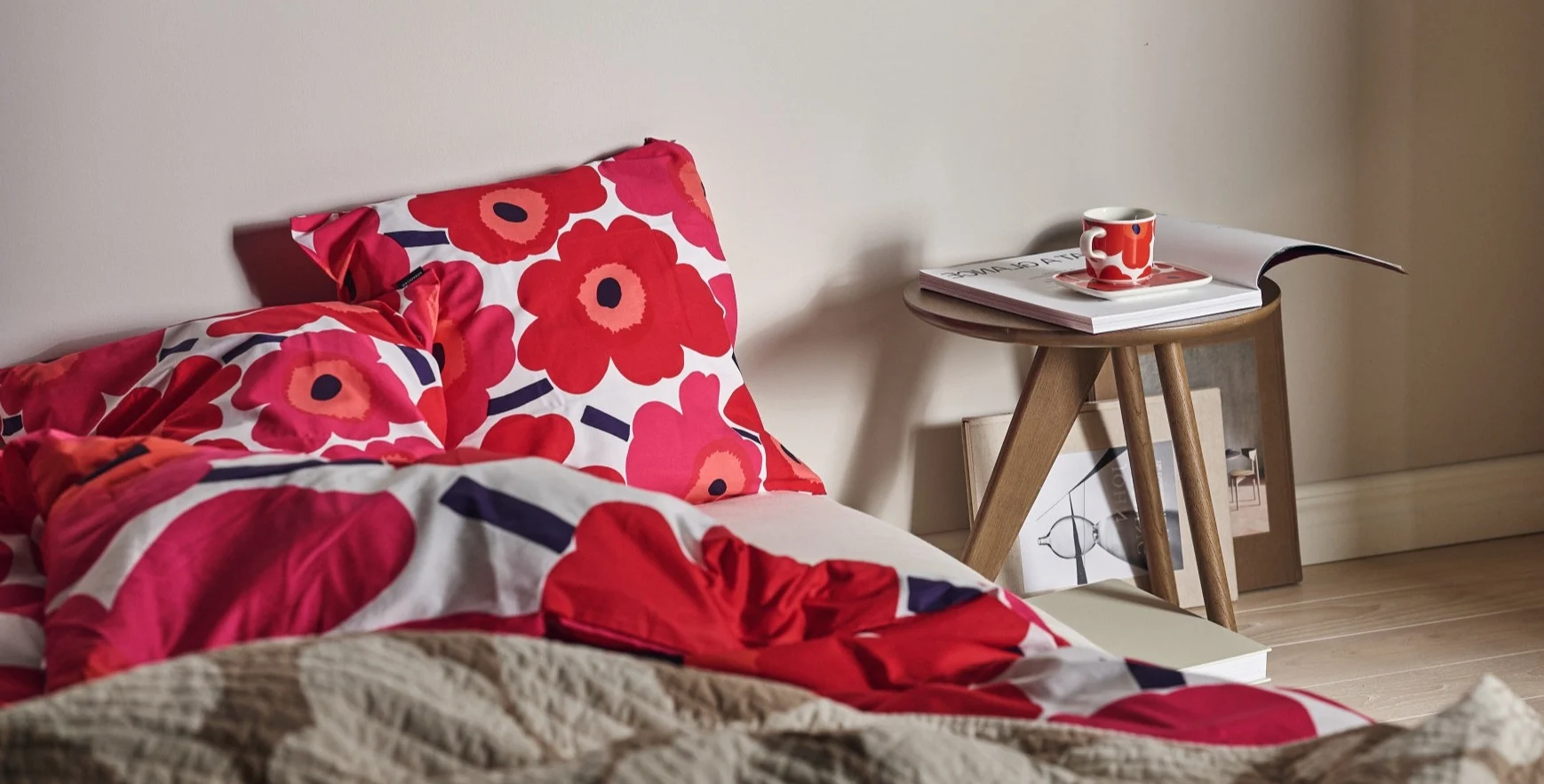 Die beliebten Muster der Stoffe finden sich in vielen Textilien wieder. Von Kissenbezügen zu Bettwäsche bis hin zu Tischdecken und Marimekko Handtücher.