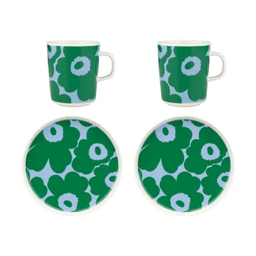 Das Unikko Frühstücksset von der finnischen Marke Marimekko besteht aus zwei Tassen und zwei Tellern aus Steingut mit dem berühmten Unikko-Muster, das in den 1960er Jahren von Maija Isola entworfen wurde. Die Form der Tassen und Teller wurde wiederum von Sami Ruotsalainen gestaltet. Das blumige Set eignet sich genauso gut für den Kaffee mit Freunden wie für das Frühstück mit der Familie.