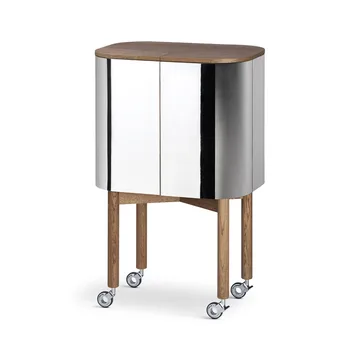 Loud Barschrank auf Rädern von Northern ist ein auffälliger Schrank, entworfen von Färg & Blanche. Glatte Konturen und ein Korpus, bekleidet mit poliertem Aluminiumlaminat, erzeugen einen blendenden Spiegeleffekt, der den Blick fängt, während die Tischplatte und die Beine aus geräuchertem Eichenholz Wärme und Charakter verleihen. Der Schrank steht auf Metallrollen, wodurch er sich beim Eindecken oder bei Raumveränderungen leicht verschieben lässt. Ein selbstbewusstes, funktionales Element im Zuhause, das Design und Nutzbarkeit kombiniert — perfekt für alle, die einen starken und persönlichen Ausdruck suchen.