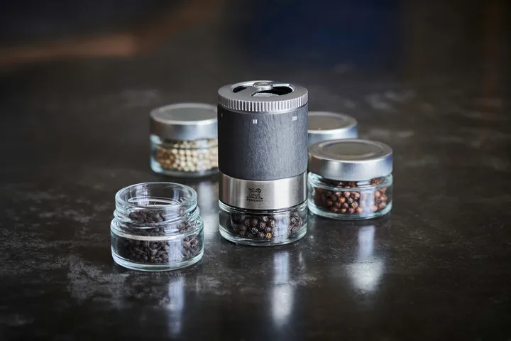 Die Maestro Pfeffermühle 11 cm von Peugeot ist eine stilvolle und funktionale Mühle aus hochwertigem Buchenholz, Edelstahl und Glas. Mit ihrem eleganten Aussehen passt sie genauso gut in die moderne Küche wie auf den klassischen Esstisch. Die Pfeffermühle kommt mit drei austauschbaren Gläsern, die drei verschiedene Sorten von Premium-Pfeffer enthalten - 20 g Kampot Schwarzer Pfeffer, 20 g Sikara Weißer Pfeffer und 20 g Voatsiperifery Wildpfeffer. Die Maestro Pfeffermühle mahlt mühelos deinen Lieblingspfeffer in der gewünschten Körnung und lässt den Geschmack von frisch gemahlenem Pfeffer den Geschmack deiner Gerichte verfeinern. Das praktische und ergonomische Design der Maestro Pfeffermühle macht sie einfach zu bedienen, und das transparente Glasfenster ermöglicht es, leicht zu sehen, wie viel Pfeffer noch vorhanden ist. Dank ihrer kompakten Größe passt sie perfekt auf den Esstisch oder in die Küche.