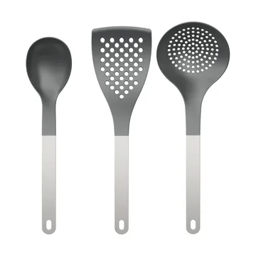 Das Optima Küchenutensilien 23 Teile von Rosti ist ein Set mit drei Utensilien aus strapazierfähigem Nylon, das sie schonend zu beschichteten Pfannen und Töpfen macht. Das Set enthält einen Servierlöffel, eine perforierte große Palette und einen großen Schaumlöffel. Die Utensilien sind hitzebeständig bis zu 220 °C, verfügen über ein ergonomisches Design mit Aufhängelöchern und sind spülmaschinengeeignet, was sie praktisch für den täglichen Gebrauch macht.
