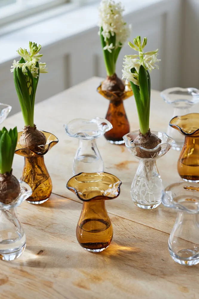 Viva Vase mini 14cm von Sagaform ist eine kleine, charmante Vase, entworfen, um die Formen der Natur zu feiern. Mundgeblasenes Glas verleiht jedem Exemplar eine einzigartige Charakteristik; die Oberseite erinnert an eine frisch geöffnete Blume, während die Basis von einem Regentropfen inspiriert ist. Die gerundete Öffnung eignet sich für Hyazinthenzwiebeln, kleine Blumen oder Stecklinge und hält sie sicher an ihrem Platz. Stellen Sie sie allein als hübsches Detail oder kombinieren Sie sie mit anderen Vasen der Viva-Kollektion zu einer lebendigen Gruppierung, die Fensterbank oder Regal aufwertet.