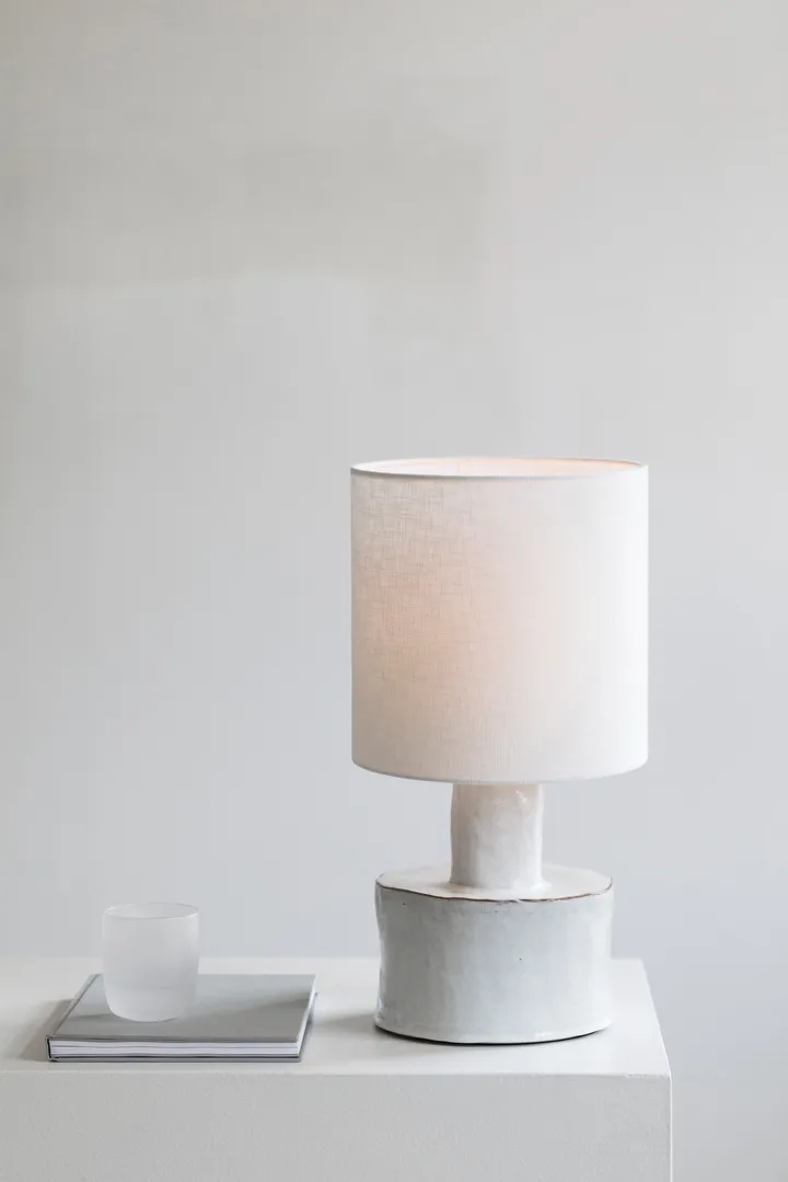 Catherine Tischleuchte 47cm von Serax ist eine stilvolle und zeitlose Leuchte, entworfen von Marie Michielssen. Die 47 cm hohe Leuchte verfügt über einen abgerundeten weißen Keramikfuß und einen weichen Stoffschirm, der ein warmes und angenehmes Licht verbreitet. Die Catherine Tischleuchte ist eine elegante Ergänzung für den Nachttisch, das Regal oder die Kommode und schafft eine entspannte und einladende Atmosphäre im Zuhause.