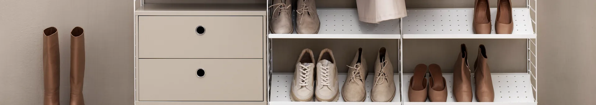 Der Flur sorgt für den ersten Eindruck eines Zuhauses, weshalb ein gut organisierter Flur, in welchem alle Kleidungsstücke seinen Platz haben, essentiell ist. Er ist der erste Raum, den Sie betreten, wenn Sie nach Hause kommen und der erste Bereich, den Ihre Gäste sehen, wenn sie Sie besuchen. Lassen Sie sich von der Vielseitigkeit des String-Regals inspirieren, um eine maßgeschneiderte Aufbewahrungslösung in Ihrem Flur zu schaffen, die Ihren Bedürfnissen entspricht. Das String Regal bietet zahlreiche Möglichkeiten, egal, ob Sie Aufbewahrung für mehrere Schuhe, verschiedene Accessoires wie Handschuhe und Sonnenbrillen oder ausreichend Platz für Oberbekleidung wie Jacken und Mäntel benötigen