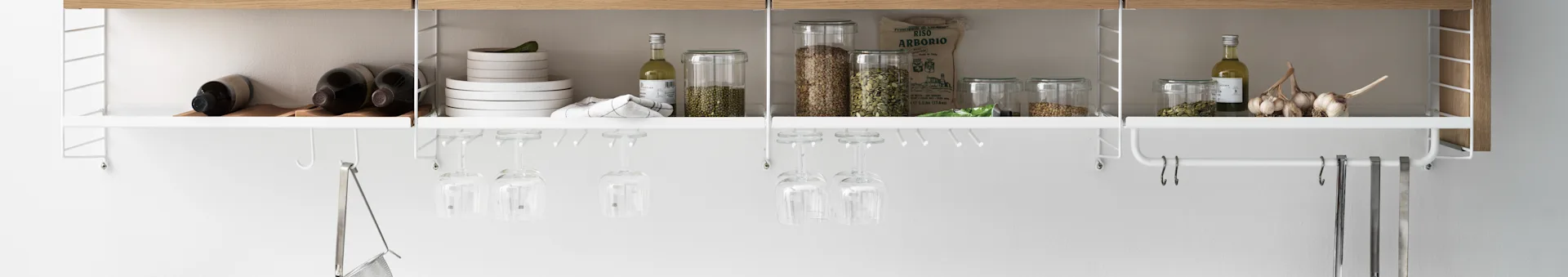 Entdecken Sie die praktischen und intelligenten Möglichkeiten für die Aufbewahrung Ihrer Küchenutensilien mit einem oder mehreren String Regal. Dank String können Sie maßgeschneiderte Aufbewahrungsmöbel für Ihre Küche kreieren: Sie können Schubladen für die Aufbewahrung von Servietten oder Handtücher wählen, Schränke zum Verstauen von Vorratsartikeln und Vitrinen mit Glastüren für die Verwahrung von Gläsern und Vasen. Zudem bietet das String-System in der Küche eine komfortable Möglichkeit, auch kleinere Küchenutensilien wie Besteck und Messer perfekt zu organisieren.