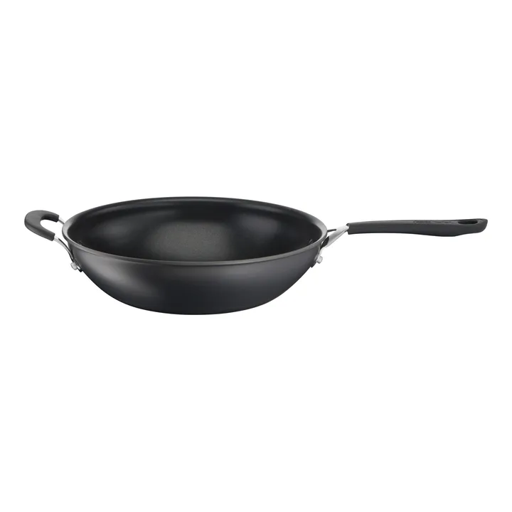 Jamie Oliver Quick & Easy Wokpfanne hart eloxiert von Tefal ist eine robuste und benutzerfreundliche Wokpfanne, entwickelt in Zusammenarbeit mit Jamie Oliver. Die hart eloxierte, mit Titan verstärkte Antihaftoberfläche erleichtert das Braten und macht die Reinigung schnell, zugleich widersteht die Pfanne alltäglichem Verschleiß. Der griff ist genieted und mit Silikon überzogen für sicheren, komfortablen Halt, und das Thermo-Signal™ zeigt an, wann die Pfanne die ideale Brattemperatur erreicht hat. Kompatibel mit allen Kochfeldern und ofenfest bis 210 °C — perfekt für schnelle Alltagsgerichte und echte Kochfreude.