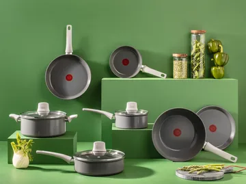 Das Renew ON Pfannen-Set im 2 Teile von Tefal ist aus recyceltem Aluminium hergestellt. Diese in Frankreich hergestellten Pfannen haben eine langlebige keramische Antihaftbeschichtung, die das Kochen mit weniger Fett erleichtert. Mit dem intelligenten Temperaturindikator Thermo-Signal™ und der Kompatibilität mit allen Herdarten bieten sie eine einfache Handhabung und Reinigung.