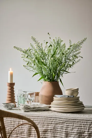 Leon Tischtuch 145x270 cm från Tell Me More ist ein handgewebtes Tischtuch aus 100% Leinen mit dekorativer Saumkante, die das Eindecken sowohl für festliche Anlässe als auch den Alltag aufwertet. Das gestreifte Design wirkt ruhig und die gröbere Leinenqualität schafft eine schöne Struktur und Haptik. Der Leinenstoff ist pflanzengefärbt, was lebendige Farbnuancen erzeugt und zu einer warmen, einladenden Atmosphäre am Tisch beiträgt. Kombinieren Sie mit Servietten und Küchentüchern aus der Leon-Serie für ein harmonisches und durchdachtes Tischbild