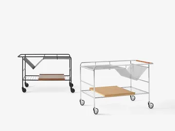Der Alima Aufbewahrungswagen lackierte Walnuss von &Tradition wurde von Note Design Studio entworfen und aus Stahl mit einem Tablett aus Walnuss hergestellt. Mit einer eingebauten V-Form bietet er genügend Platz für Bücher, Zeitschriften und andere Gegenstände, die Sie griffbereit haben möchten, wenn Sie beispielsweise von zu Hause aus arbeiten.