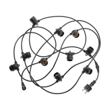 Lichterkette außen, erweiterbar von Unison ist eine robuste Lichterkette aus 100 % Gummi, die das ganze Jahr über stimmungsvolle Außenbeleuchtung schafft. Die wetterfeste Konstruktion mit IP44 macht die Lichterkette ideal für Garten, Balkon und Terrasse. E27-Fassungen bieten die Möglichkeit, Lichtquellen nach gewünschtem Stil und Helligkeit zu wählen. Die Kette hat Lampenhalter mit einem Abstand von 50 cm und kann modular auf bis zu 200 Meter erweitert werden. Eine flexible Lösung für Alltag und Fest, die ein warmes und einladendes Licht erzeugt.