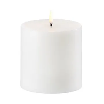 Die Uyuni LED Blockkerze Weiß mit einem Durchmesser von 10,1 cm der dänischen Marke Uyuni Lighting hat alles, was eine normale Kerze hat – nur sicherer und mit längerer Nutzungsdauer. Das leicht flackernde und patentierte 3D-Flammenlicht, in Kombination mit der paraffinbehandelten Oberfläche, lässt die LED-Kerze echt wirken und sie vermittelt im Raum das gleiche sanfte und einladende Gefühl, wie brennende Kerzen. Kombinieren Sie die Kerze mit der Uyuni Fernbedienung, um beispielsweise die Dimmfunktion zu nutzen und den Timer auf 4, 6, 8 oder 10 Stunden zu stellen, anstatt nur den integrierten 6-Stunden-Timer verwenden zu können.