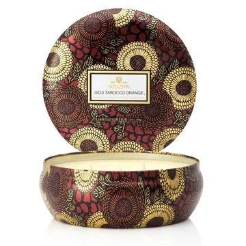 Die 3-Docht Duftkerze in Dose der kalifornischen Marke Voluspa ist wie der Name bereits verrät, eine Duftkerze in einer wunderschön gemusterten Blechdose, welche mit parfümiertem Kokoswachs und drei Dochten befüllt ist. Die Duftkerze hat eine Brenndauer von 60 Stunden und wenn die Kerze abgebrannt ist, kann die Dose wunderbar als Verpackung oder Aufbewahrung von Schmuck und anderen kleinen Gegenständen verwendet werden. Die exklusive und edle Duftkerze eignet sich auch ideal als Geschenk. Die qualitativ hochwertigen Duftkerzen von Voluspa sind bekannt für ihrelange Brenndauer und für ihre angenehmen Düfte.