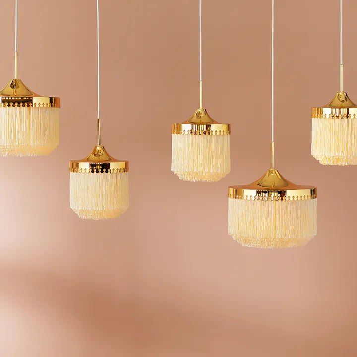 Die Fringe Pendelleuchte von Warm Nordic ist eine elegante Deckenleuchte mit Fransen, die Ihrem Raum Charakter und Charme verleiht. Die Fransenleuchte Fringe ist eine Neuinterpretation einer Lampe, die ursprünglich in den 60er Jahren von Hans-Agne Jakobsson entworfen wurde. Diese moderne Version hat ein etwas minimalistischeres Design, das die Kontraste zwischen dem polierten Metall und den weichen Fransen hervorhebt.
