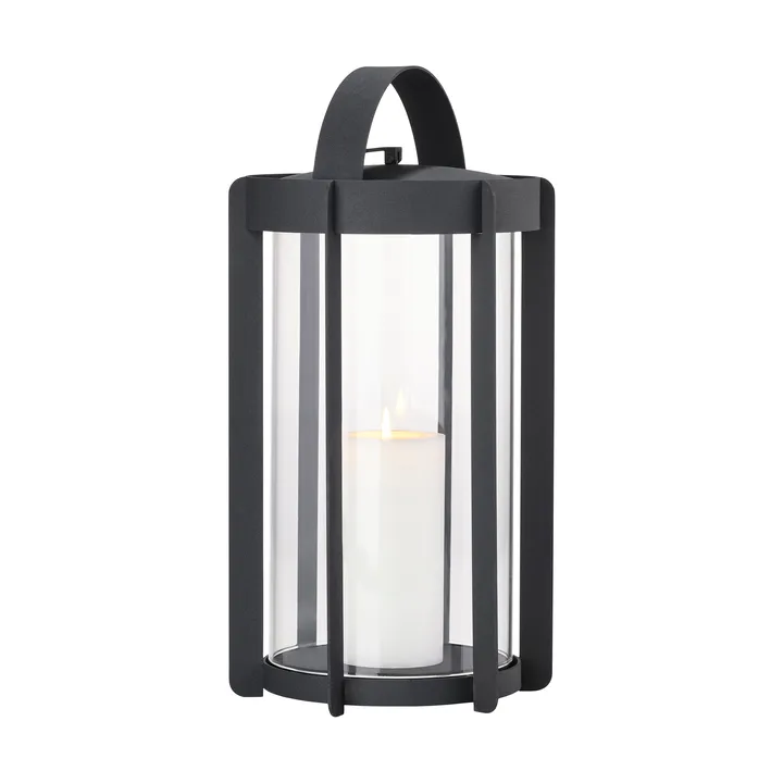 Das Firefly Lanterna Windlicht 35 cm von Zone Denmark ist aus pulverbeschichtetem Stahl mit Glaswänden gefertigt. Das Oberteil kann leicht mit einem Silikonband abgenommen werden, um die Kerze zu wechseln. Das Design ist von historischen Laternen inspiriert und schafft eine gemütliche Atmosphäre auf Terrassen und Balkonen.
